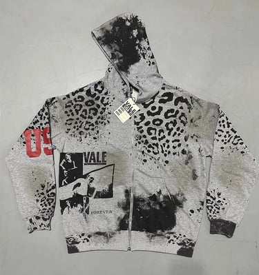 This zip-up hoodie combines comfort and style in a unique way, standing out thanks to its bold and eye-catching graphic design.